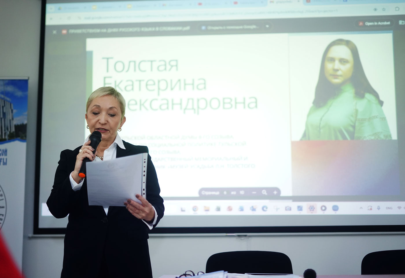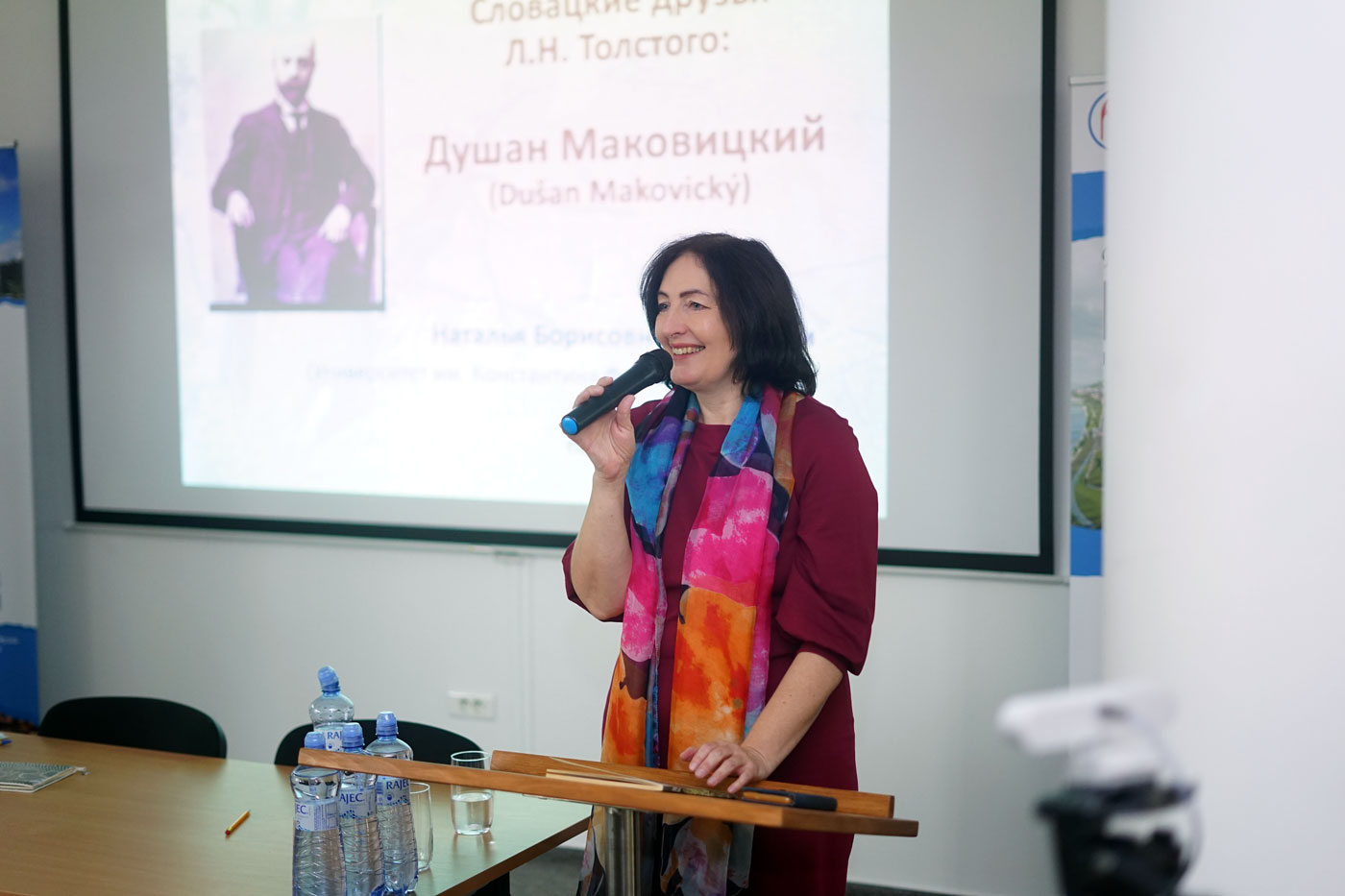 Третья часть мероприятия включала увлекательную лекцию профессора, доктора философских наук Натальи Борисовны Месельми о Льве Толстом и его словацких друзьях — Душане Маковицком и Альберте Шкарване. Учащиеся гимназий уже были знакомы с деятельностью Маковицкого, поэтому встреча прошла в живом интерактивном формате: ребята активно включались в обсуждение и дополняли рассказ фактами о жизни этого выдающегося словацкого врача и переводчика.